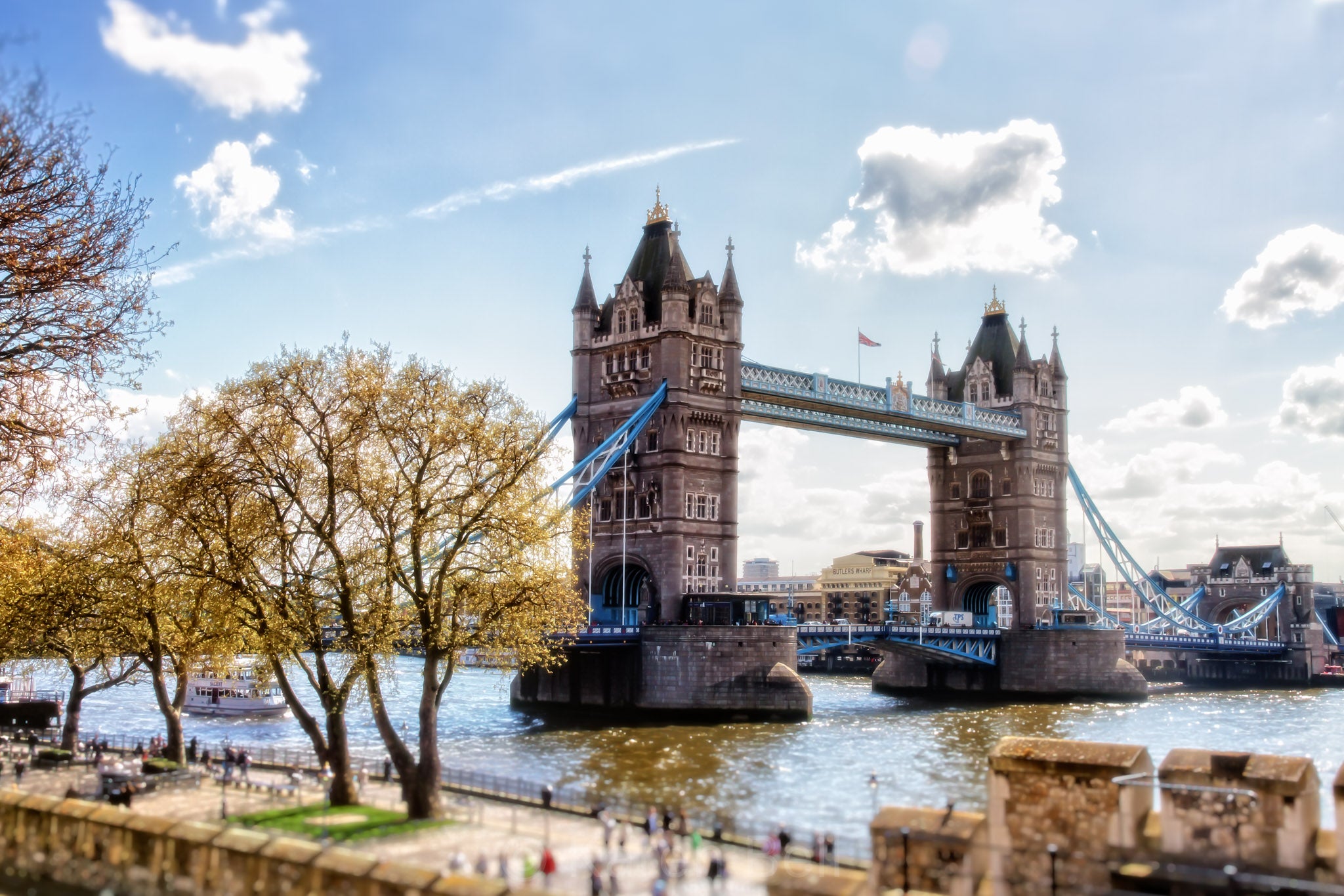 Taken from the upper walls inside the Tower of London, here is the majestic and iconic Tower Bridge crossing over the busy River Thames. A beautiful view in a bustling metropolis.